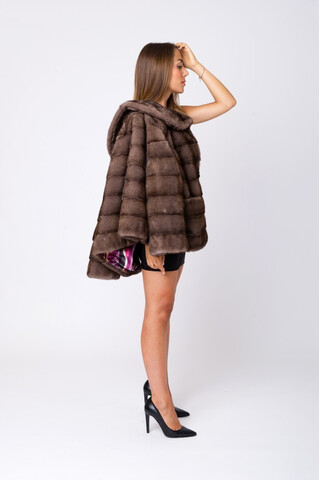 Sage female Scandinavian mink jacket, half-back "half-back" leather. The hanging of the "band" sleeve allows to create a pleasant continuous effect. Soft model the length of cm. 65. Closure with hooks and button, pockets with horizontal cut. The Scandinavian mink is characterized by a short and silky hair, very light and soft and at the same robust.