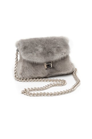 Mini borsa modello Alvina in visone a pelle intera grigio avio, con manico e tracolla in metallo.